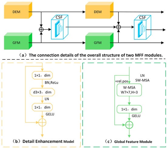 (a) Structural diagram of two MFF connections; (b) Detail Enhancement Module (DEM) detail diagram; (c) Global Feature Module (GFM) detail diagram.