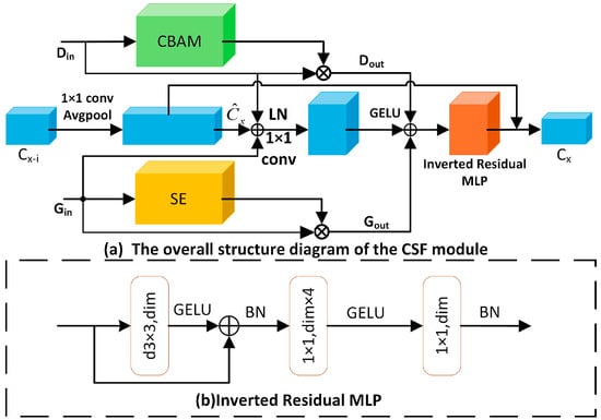 The CSF feature fusion block dynamically combines detailed information, global features, and the fused output from the previous layer across different levels based on the input features. The overall structure is illustrated in Figure 5a. Here, Din denotes the feature matrix produced by the detail enhancement module, Gin represents the feature matrix from the global feature module, Cx−i refers to the feature matrix from the preceding CSF layer, and Cx signifies the feature matrix generated by fusing the current CSF layer.