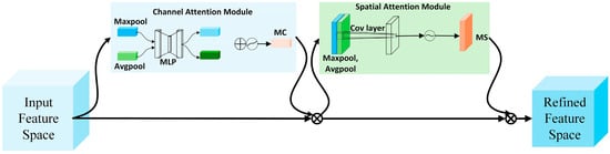 CBAM [26] is a lightweight, versatile plug-and-play attention module developed to enhance the performances of CNNs. It integrates the Channel Attention Module (CAM) and the Spatial Attention Module (SAM) by concatenating them, allowing the network to focus on important features in both the spatial and channel dimensions. This approach improves feature extraction and optimizes the feature space. Figure 6 illustrates the CBAM attention module.