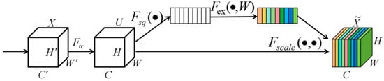The input feature map is denoted as , where represent the number of channels, height, and width, respectively. Through a forward convolution operation , the feature map is transformed into . Next, a squeeze operation , a global average pooling layer, is applied to compress the spatial dimensions of each channel, resulting in a channel descriptor vector. This vector is then passed through an excitation operation , which consists of a set of fully connected layers to generate the channel attention weights. Finally, a scaling operation is used to apply the generated weights to the original feature map U, producing the final weighted output feature map.