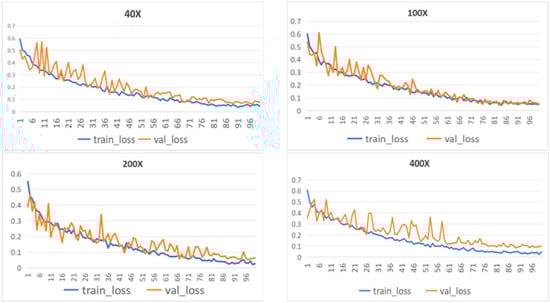 To further evaluate the training stability of the model, Figure 8 presents the loss curves for both the training and validation sets throughout the training process. By plotting the validation loss (val_loss) and training loss (train_loss), the convergence and learning effectiveness of the model can be observed. A greater overlap between the two curves indicates more stable training and better convergence. The results show that the model exhibits a stable convergence trend across datasets at four different magnification levels. Notably, for the 100× magnification dataset, after 70 epochs, the training and validation loss curves nearly coincide, demonstrating the model’s strong learning capability. These results indicate that the model can effectively capture key abstract features from breast histopathological images while avoiding overfitting, thereby supporting the reliability of its subsequent predictive performance.
