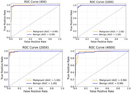 Figure 9 presents the ROC curves of the proposed model at various magnification levels. The results indicate that at 100× and 200× magnifications, both malignant and benign categories reach a perfect average Area Under the Curve (AUC) value of 1.00. At the 40× magnification, the average AUC for both categories is 0.99, while at 400× magnification, it slightly decreases to 0.98. These findings highlight the exceptional performance of the MFF-ClassificationNet model across different magnifications, further showcasing its robust classification capability.