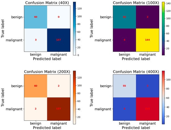 Subsequently, by analyzing the confusion matrix of one representative test set selected from the five independent experiments (as shown in Figure 10), the correct and incorrect classifications for each category can be visually observed. At the 40× magnification level, this specific test set contains 63 benign samples and 137 malignant samples. The confusion matrix shows that 60 benign samples were correctly classified, while 3 were misclassified, resulting in a classification accuracy of 95.23%. Meanwhile, all 137 malignant samples were correctly classified, achieving a 100% accuracy rate. This result indicates that the model exhibits a stronger ability to recognize malignant cells at this magnification level. At 100×, 200×, and 400× magnifications, the model demonstrates more balanced classification performance, maintaining stable recognition capabilities for both benign and malignant samples. Overall, the proposed model exhibits consistently balanced and stable performance across different magnification levels.