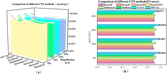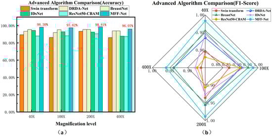 Figure 12a,b compare the classification accuracy and F1-score of several advanced algorithms across four magnifications. The results clearly show that MFF-ClassificationNet consistently achieves the highest Accuracy and F1-score at all magnifications. This demonstrates its notable performance advantage over other algorithms, ensuring more precise image classification while effectively maintaining a balance between precision and recall.