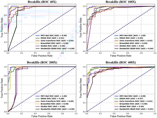 Figure 13 presents the ROC curve comparisons of various advanced models on the BreakHis dataset at different magnifications. The ROC curve is a crucial tool for evaluating classification models, providing a clear depiction of the trade-off between sensitivity and specificity. By examining the ROC curve, one can assess a model’s performance, with curves nearer the top-left corner indicating higher accuracy. In Figure 12., the comparisons of ROC curves clearly illustrate the performance differences among the models at each magnification level.