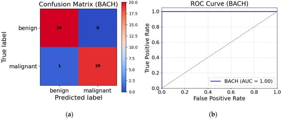 To further evaluate the performance of the MFF-ClassificationNet model, a comprehensive analysis was conducted using its confusion matrix and ROC curve on the BACH dataset. Figure 14a presents the confusion matrix for the test dataset, which includes 20 benign and 20 malignant samples. The matrix shows that the model correctly classified all benign samples, achieving a perfect accuracy of 100% for this category. Only one malignant sample was misclassified, highlighting MFF-ClassificationNet’s ability to accurately identify benign cells while maintaining strong performance in detecting malignant samples. Additionally, the AUC value of the MFF-ClassificationNet model on the BACH dataset was computed, and the corresponding ROC curve is shown in Figure 14b.