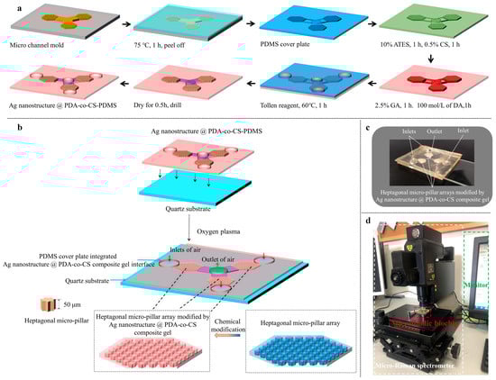 The modified PDMS cover plate was assembled using a flat PDMS sheet. The flat sheet contained three holes aligned with the micropillar arrays, serving as reaction chambers. Tollens reagent was injected into these chambers and allowed to react at 60 °C for 1 h. After reaction, the unreacted reagent was removed through rinsing with deionized water. The flat PDMS sheet was peeled away, and the substrate was dried for 0.5 h, yielding a PDMS structure modified with the Ag nanostructure @ PDA-co-CS composite gel (Ag nanostructure @ PDA-co-CS-PDMS). Inlet and outlet ports were drilled into the structure. The final biochip was assembled by bonding the Ag nanostructure @ PDA-co-CS-PDMS to a quartz substrate via oxygen plasma treatment (Figure 1b). A physical image of the resulting microfluidic biochip is presented in Figure 1c.