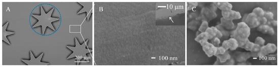 SEM images. (A) The PDMS cover plate integrated with the heptagonal micropillar array. The blue circle outlines the top view of a single micropillar. (B) A detailed view of the array after modification with a PDA-co-CS composite gel, showing the inter-pillar region indicated by the white rectangle in (A). The inset shows a cross-sectional view of the micropillar. The thin gel layer on its top is indicated by the white arrow. (C) The Ag nanostructure adhered to the PDA-co-CS composite gel.