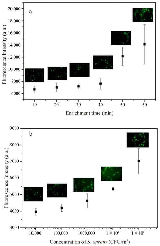 To optimize the sampling time, aerosol of fluorescently labeled S. aureus (109 CFU m−3) was generated and enriched for 10, 20, 30, 40, 50, and 60 min, at a flow rate of 1.8 L min−1. The captured bacteria were subsequently detected using a fluorescence spectrometer (Omni—λ 300i Monochromator/Spectrograph, Zolix, Beijing, China) and a CX40 upright fluorescence microscope (Ningbo Shunyu Instrument Co., Ltd., Ningbo, China).