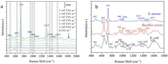 As is known, S. aureus is the most common pathogenic bacteria in aerosols, especially those in hospitals, livestock farms, and other places. S. aureus was selected as the model for studying the detection performance of the designed biochips. Biochips were used to capture and enrich the S. aureus aerosols under the optimal conditions. SERS was applied to detecting the captured bacteria in situ. SERS spectra of S. aureus with a concentration of 104~109 CFU m−3 were obtained, as shown in Figure 5a. The SERS spectra of S. aureus were assigned using research from the literature [29,50,51]. Characteristic Raman peaks were observed at 723 cm−1, 948 cm−1, and 1317 cm−1. The intensity of the characteristic peaks increases with the concentration of S. aureus. When the concentration of S. aureus was 104 CFU/m3, the peaks at 948 cm−1 and 1317 cm−1 were barely detectable, which was not enough to realize the identification of S. aureus. Therefore, the lowest concentration of S. aureus that could be detected in situ and identified using the microfluidic biochip was determined to be 105 CFU/m3.