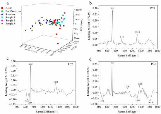 (a) The 3D-PCA plot for the three different bacteria and strict class prediction for unknown bacteria samples by the PCA model. (b) PC1 loading plot. (c) PC2 loading plot. (d) PC3 loading plot.