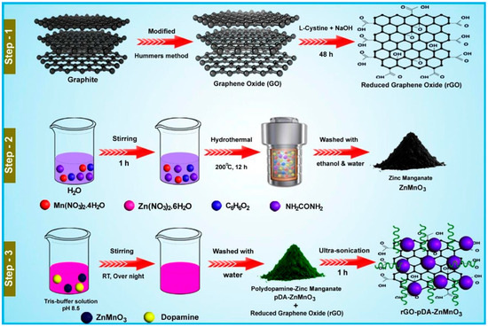 Schematic representation of the preparation of rGO-pDA-ZnMnO3. Reprinted with permission [36].