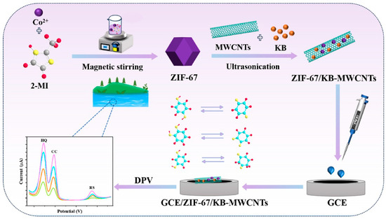 Schematic illustration of the fabrication of GCE/ZIF-67/KB-MWCNTs for electrochemical sensing applications. DPV curves show the detection of HQ, CC, and RS. Reprinted with permission [45].
