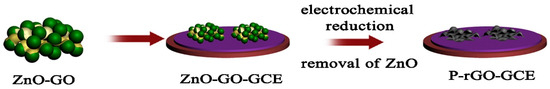 It is well known that rGO is one of the most conductive carbon materials, which has excellent electronic and surface properties. The porosity of the electrode materials also affects the electrochemical sensing performance of the sensors. In this connection, porous rGO (P-rGO) was fabricated using an electrochemical reduction approach by using ZnO as a sacrificial template [49]. The fabrication process has been described in Figure 3.