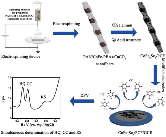 In a previous study [60], it was observed that the incorporation of tungsten sulfide (WS2)-modified Gr (WS2-Gr) may show higher electrical conductivity and catalytic behavior for electrochemical reactions. WS2 is one of the less toxic metal sulfides which has several advantages such as cost-effectiveness and layered structure. The prepared composite may exhibit higher electrical conductivity due to the presence of synergism between WS2 and Gr. The WS2/Gr composite was coated on a GCE surface for the monitoring of phenolic isomers. The developed electrochemical sensor shows high electrocatalytic properties towards the determination of RS using the DPV technique. The WS2/Gr composite-modified electrode demonstrated higher current response for RS detection compared to the bare GCE, which is ascribed to the excellent catalytic properties and synergism of the prepared electrode material. The real sample studies suggested that the WS2/Gr composite is one of the promising and efficient materials for the development of RS electrochemical sensors for environmental monitoring. The cobalt–iron selenides incorporated porous carbon nanofibers (CoFe2Se4/PCF) were synthesized using facile conditions [61]. The electrode’s fabrication has been illustrated in Figure 5.