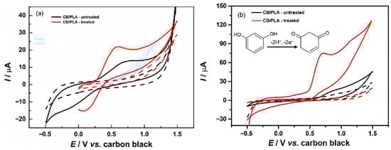 CV curves of CB/PLA before (black data) and after electrochemical treatment (red data) in the presence of (solid lines) and absence (dashed lines) of 1 mM [Fe(CN)6]3−/4− in 0.1 M KCl (a). CV curves of the same electrodes in presence of 1 mM RS (b). Inset of Figure (b) shows electro-oxidation reaction for RS detection at electrode surface. Reprinted with permission [70].
