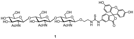 A new approach for lysozyme activity determination was proposed by using a fluorescence polarization assay (FPA), which was developed to study the activity of type-C lysozyme for diagnostic purposes, using fluorescently labeled natural peptidoglycan [28,31]. This inherent variability in natural peptidoglycan posed significant challenges in comparing lysozyme activity measurements across different experiments or laboratories, hindering reproducibility and standardization. The inconsistencies stemmed from variations in peptidoglycan structure and composition depending on bacterial source and extraction methods. These variations directly impacted the enzyme’s binding affinity and subsequent hydrolysis rate, leading to unreliable results. It is known that in addition to muramidase activity, lysozyme also has chitinase activity, therefore synthetic fluorescently labeled glycoconjugates—precisely defined, homogenous substrates—provide a much-needed standardized approach [32]. These synthetic substrates, chitooligosaccharides, including the chitotrisaccharide 1 (Figure 1) offer superior control over substrate composition, length, and labeling density. This ensures consistency in experimental conditions, minimizing the variability seen with natural peptidoglycans.
