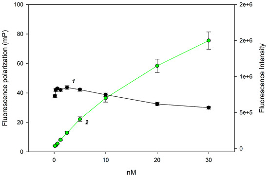 FPA is one of the most promising methods for the rapid and accurate detection of intermolecular interactions [23], including antigen–antibody binding [24] and enzyme–substrate recognition [25,26]. Fluorescence polarization analysis (FPA) is a detection method based on fluorescence measurement, widely used to study intermolecular interactions in solution. The method relies on the change in the rotational diffusion rate of a fluorescent molecule with changes in its size [27]. It is known that after irradiation with plane-polarized light, a substance can emit different fluorescence intensities in different planes. As the molecular volume of the substance increases, for example, upon binding to another molecule, its rotational diffusion rate slows, and the difference between the fluorescence intensities in the perpendicular and parallel planes increase. The fluorescence polarization signal (FP) is calculated as