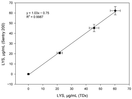Correlation between LYS concentrations in 200.0, 400.0 and 600.0 mg tablet powders determined using the Sentry 200 and TDx instruments (n = 3).
