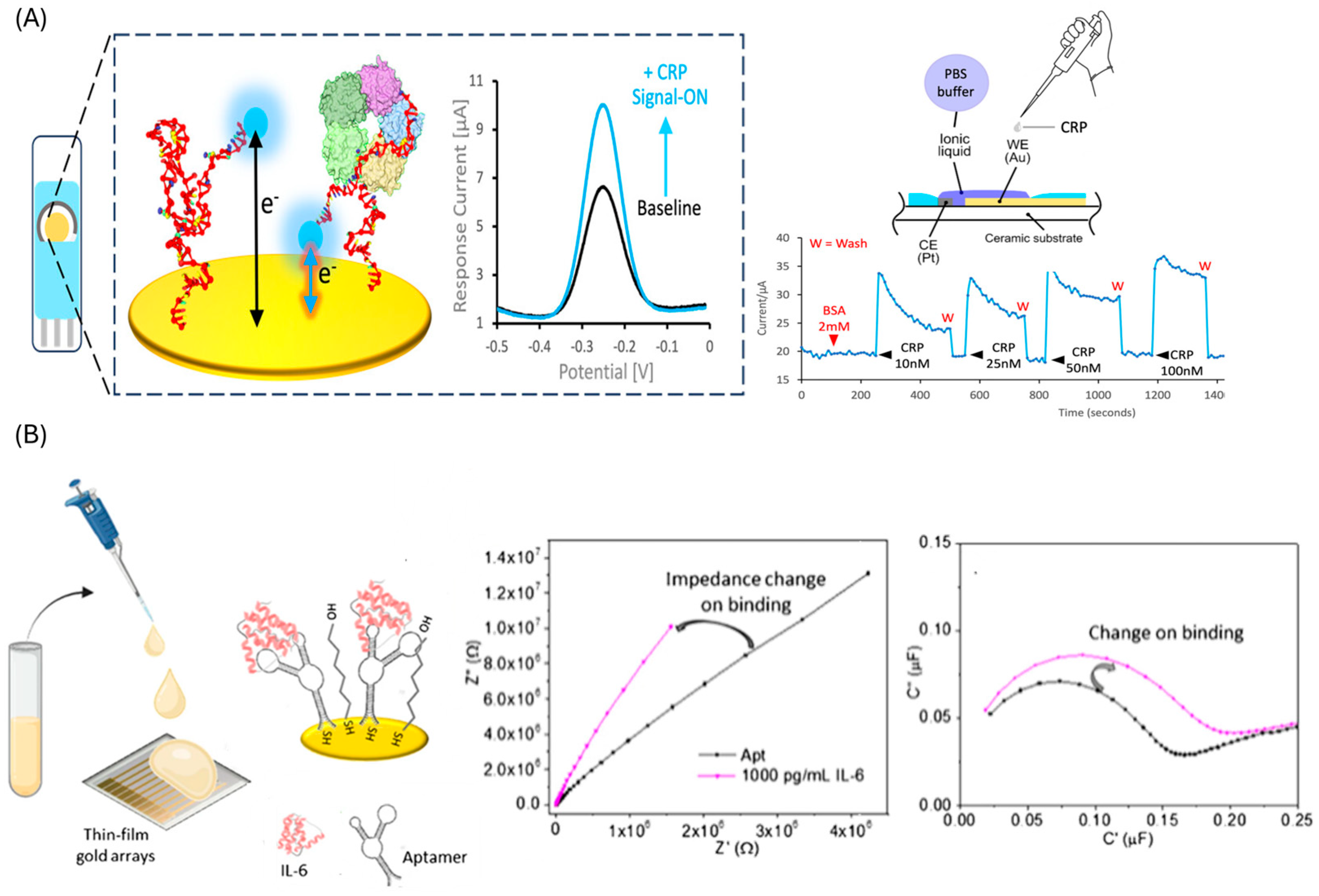 - Chen, N.; Yang, H.; Li, Q.; Song, L.; Gopinath, S.C.B.; Wu, D. An interdigitated aptasensor to detect interleukin-6 for diagnosing rheumatoid arthritis in serum. Biotechnol. Appl. Biochem. 2021, 68, 1479–1485. [Google Scholar] [CrossRef] [PubMed]