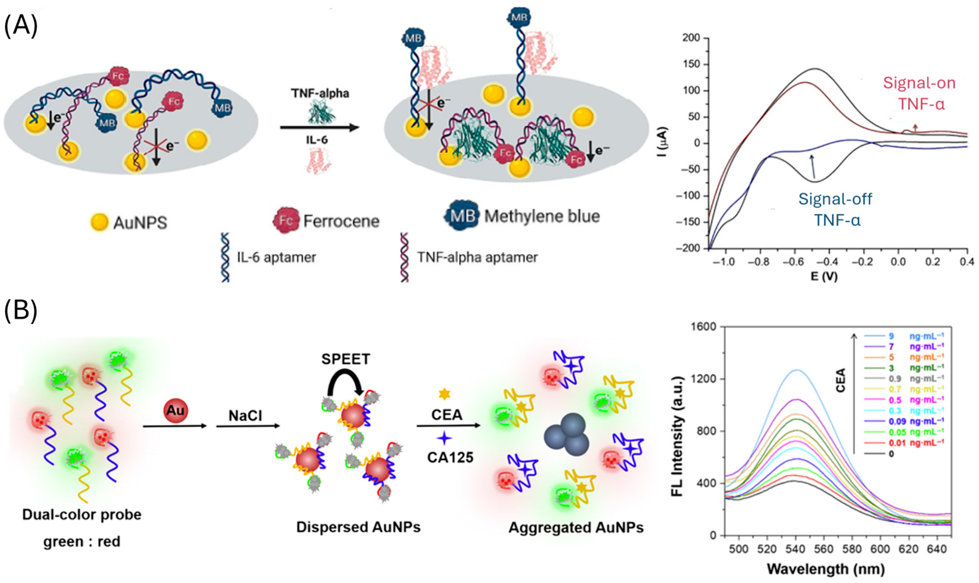 - Irimes, M.B.; Pusta, A.; Coker, D.; Martian, P.C.; Suciu, M.; Pandrea, S.L.; Tertis, M.; Cristea, C.; Oprean, R. Dual-target electrochemical aptasensor for the simultaneous detection of interleukin-6 and tumor necrosis factor-α in biological fluids. Sens. Bio-Sens. Res. 2025, 49, 100866. [Google Scholar] [CrossRef]