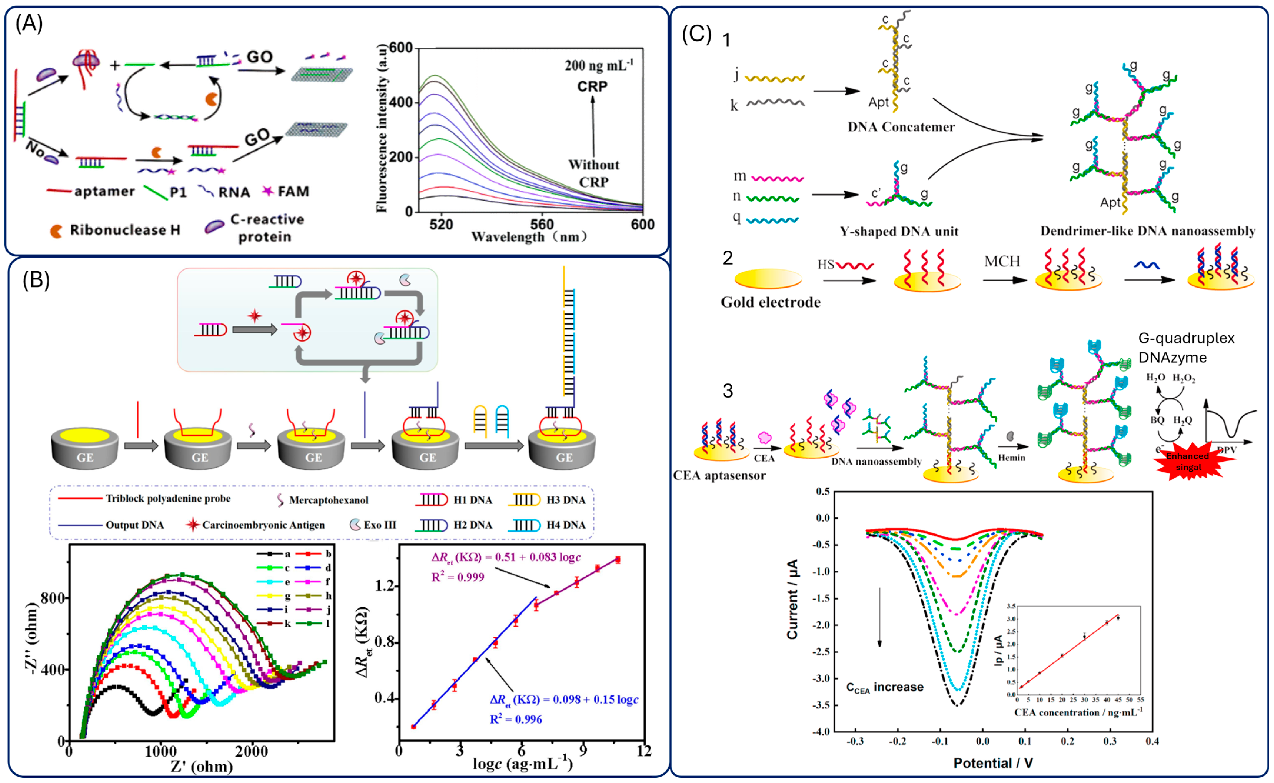 - Chen, Q.; Liu, Z.; Luo, D.; Ren, F.; Ran, F.; Chen, W.; Zhang, B.; Wang, C.; Chen, H.; Wei, J. Ultrasensitive fluorescent aptasensor for CRP detection based on the RNase H assisted DNA recycling signal amplification strategy. RSC Adv. 2019, 9, 11960–11967. [Google Scholar] [CrossRef]