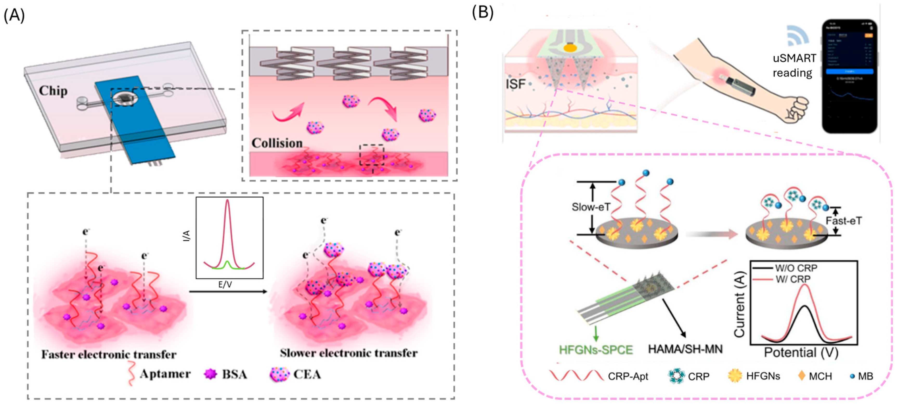 - Liu, Z.; Huang, S.; Yan, Y.; Pang, W.; Zhong, F.; Huang, Q.; Caddeo, F.; Zhang, M.; Jin, M.; Shui, L. Multiplex signal amplification for ultrasensitive CRP assay via integrated electrochemical biosensor array using MOF-derived carbon material and aptamers. Talanta 2024, 272, 125735. [Google Scholar] [CrossRef]