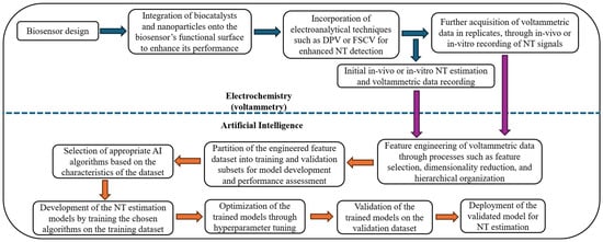 Block diagram summary of the integration of AI with biosensors and voltammetry for the estimation of neurotransmitters.