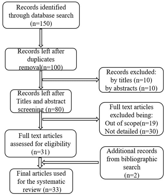 A search conducted in the specified repositories identified 150 relevant publications for this systematic review. After screening the titles, abstracts, full-text eligibility, scopes, and duplicates, 81 papers were selected. Of these, 49 were excluded for not meeting the established selection criteria. Ultimately, 31 research papers on the application of ML and DL algorithms for pattern recognition of NTs were included in the review. Additionally, 2 relevant studies found in the bibliographies of these papers were incorporated, bringing the total number of reviewed publications to 33, as presented in Figure 2.