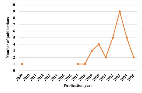 Figure 2 illustrates the process for selecting the 33 final articles included in this systematic review, with Table 3 summarizing the purposes of these articles and years of publication. Figure 3 depicts the publication trends in this field from 2009 to May 2025.