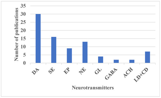 The specific types and concentrations of NTs produced in the brain influence their regulatory functions, making them important biomarkers for various neurological disorders. For example, DA levels are associated with Parkinson’s disease [83,84,85,86,87,88,89,90,91,92,93,94] and depression [93,94], GL is linked to schizophrenia [24,51], and ACH is related to Alzheimer’s disease [62]. Changes in NT concentrations can affect a range of human cognitive functions, including emotions, thoughts, memories, learning, and movement [14,15,62]. To be classified as NTs, these chemicals must meet specific criteria: (1) they must be produced and released by the same neuron and stored at the presynaptic terminal; (2) they should induce specific responses in the postsynaptic neuron; (3) their external administration should replicate these effects; and (4) their action on the postsynaptic cell should be reversible through a specific mechanism [95]. The researched NTs, whose patterns have been recognized using various ML, PR, and DL algorithms, are discussed and summarized in Table 4, and the frequency of their analysis is depicted in Figure 4.