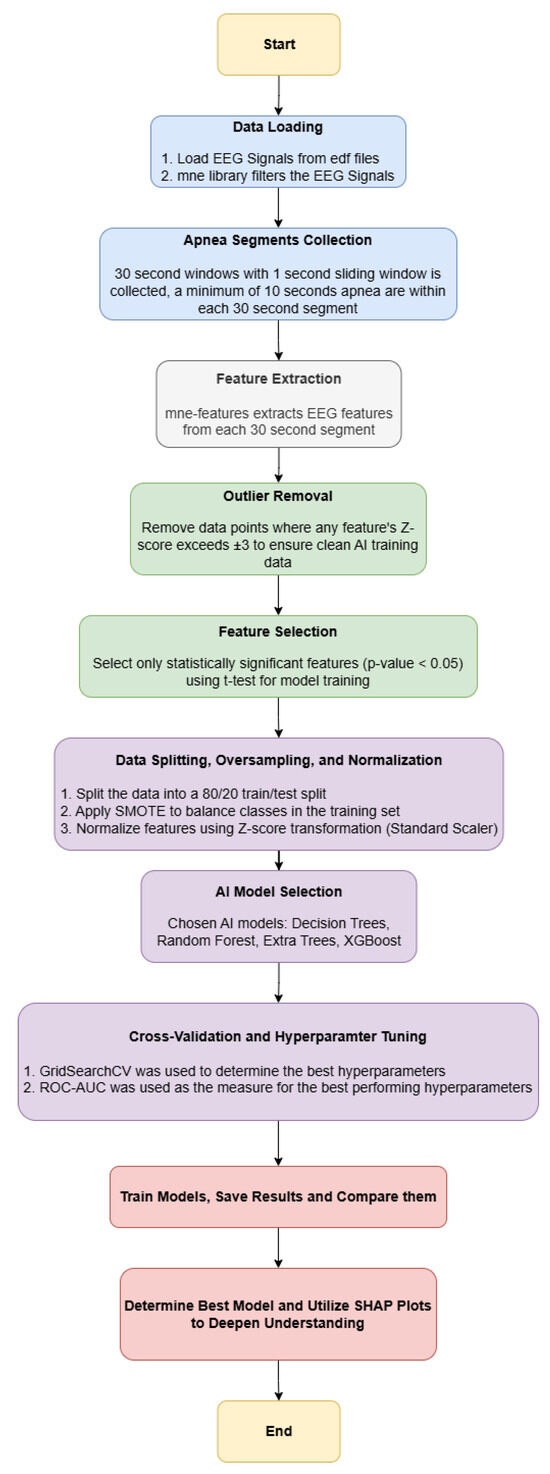 A multitude of machine learning models were tested to determine the one whose performance was most effective in the binary classification task of classifying whether a 30 s segment was either a continuous or an ending apnea event. The machine learning models that were experimented on where, Decision Trees, Random Forest, XGBoost, Extra Trees.