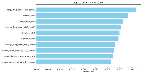The most influential features (4.1%), (3.7%), (3.6%), (3.5%), and (3.5%) show that both spectral energy modulations and higher-order statistical descriptors are critical for classification. The Teager–Kaiser energy features further reflect transient bursts linked to cortical arousal and event resolution. The narrow importance range (3.3–4.1%) suggests that apnea termination is characterized by a distributed pattern of EEG dynamics rather than dependence on any single feature.