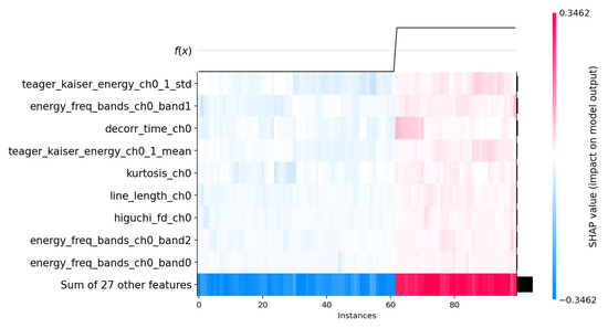 The SHAP beeswarm plot (Figure 3) provides complementary insights by illustrating how individual features influence specific classifications, with larger absolute SHAP values indicating stronger impact on model decisions. Notably, and capture energy fluctuations in the respiratory signal, helping detect airflow pattern changes that distinguish apnea from normal breathing. Similarly, frequency-domain features such as and reflect variations in respiratory rhythms associated with apnea events. The SHAP heatmap (Figure 4) further reinforces these findings by visualizing the per-instance impact of each feature on model predictions, showing consistent contributions from these energy-based and statistical metrics across multiple instances. A unique feature highlighted by SHAP, , may relate to signal stability or variations over time, potentially indicating irregular breathing patterns induced by apnea. Additionally, complexity-based features such as and continue to show strong contributions, emphasizing the importance of signal irregularity in apnea classification.
