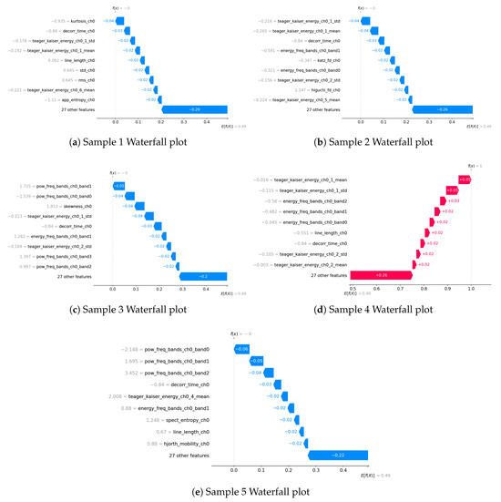 The waterfall plots (Figure 5) provide a more granular, sample-specific perspective on feature importance, complementing the global rankings observed in the Extra Trees and SHAP analyses. Consistent with previous findings, Teager–Kaiser energy features and frequency-domain energy bands appear as dominant contributors across multiple samples, reinforcing their strong role in distinguishing apnea from normal breathing. Specifically, features such as , , and are repeatedly observed, highlighting their predictive significance.