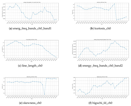 Figure 6 illustrates the variations in the top 6 EEG features from Extra Trees over time, analyzed using 30-s segments with a 1-s sliding window.