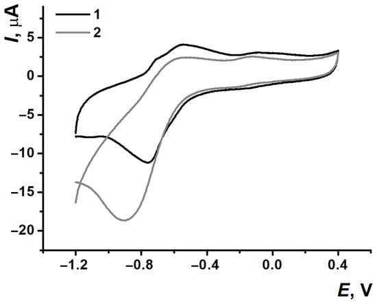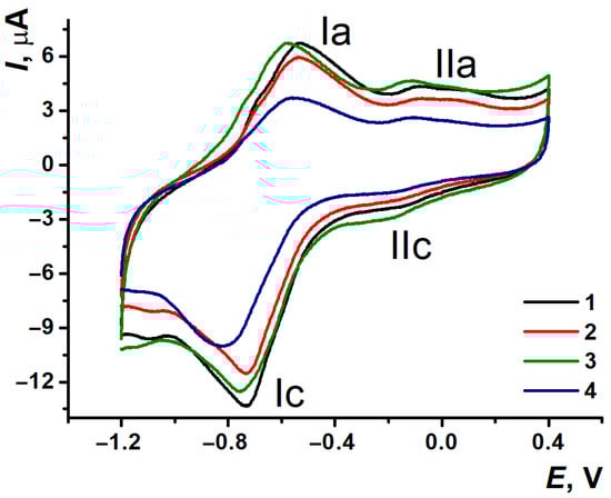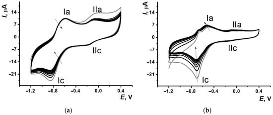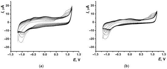 Within the potential multiple scanning for NR in PB and reline (see the conditions in Section 2.3), there were significant differences in the morphology of the voltammograms recorded (Figure 3).