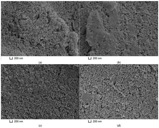 SEM images of the (a) PNRREL, (b) PNRREL(CB250G), (c) PNRREL(CB350G), and (d) PNRREL(MWCNTf) coatings.