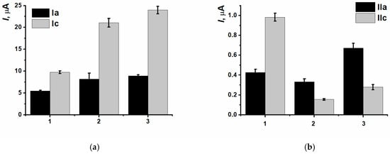 Peak currents changing for (1) SPCE/PNRREL, (2) SPCE/PNRREL/DNAss, (3) SPCE/PNRREL/PSS. (a) peaks pair (Ia/Ic), (b) peaks pair (IIa/IIc).