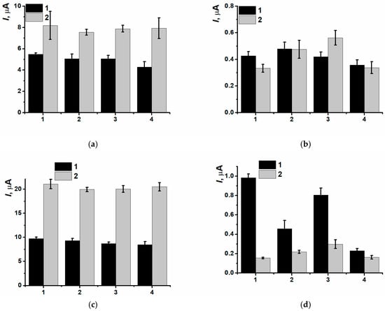 (a,b) Oxidation and (c,d) reduction peak currents dependencies on different type of CNM inclusion before (1) and after (2) DNAss drop casting onto the composite surface, (1) SPCE/PNRREL, (2) SPCE/PNRREL(CB250G), (3) SPCE/PNRREL(CB350G), (4) SPCE/PNRREL(MWCNTf).