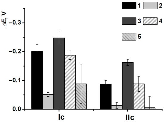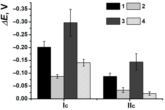 As can be seen from Table 4, the incubation in PSS solution had no significant influence on peak potentials, whereas DNAss inclusion into the coating has led to the potential shift towards the cathodic area. It is noteworthy that the maximal change in peak position was observed for the (Ic) peak potential, being about 200 mV. It was suggested to use ∆E(Ic) and ∆E(IIc) for graphical presentation of the analytical response changes obtained according to the protocol mentioned above.