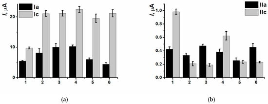 For PNRREL peak currents of (Ia), the only discrimination between damages caused by Fenton reagent (DNAox(F)) and H2O2 (DNAox(H2O2)) was possible (Figure 15), as the coatings with DNAden and DNAox(Cu) gave a similar response. The second pair of peaks in this case was more informative. The growth of (IIa/IIc) currents was provided by the increasing availability of nitrogen in inter-unit bridges for the electron exchange, as double-stranded DNAss structure damage interfered with the processes of its partial intercalation by the dye. The difference between the changes in peak currents when various damaging agents were used could be related to the interfering influence of metal cations formed as a result of ROS presence and/or their complexes with DNAss formation. The appropriate changes in peak potentials depending on DNA damage are presented in Figure 16.