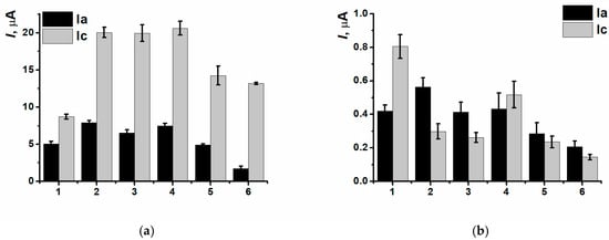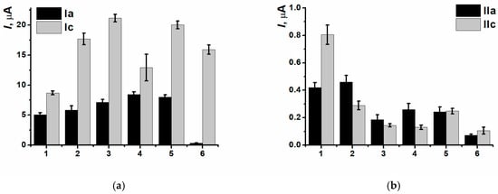 DNAss damage discrimination on (1) SPCE/PNRREL, (2) SPCE/PNRREL/DNAss, (3) SPCE/PNRREL/DNAden, (4) SPCE/PNRREL/DNAox(Cu), (5) SPCE/PNRREL/DNAox(F), (6) SPCE/PNRREL/DNAox(H2O2) with (Ia/Ic) (a) and (IIa/IIc) (b) peak currents.