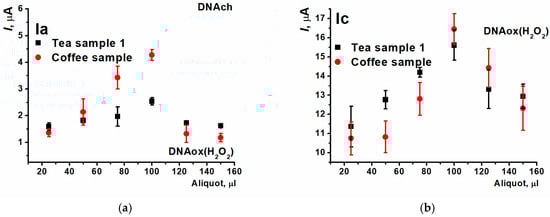 The dependence of beverage antioxidant protective effect on their aliquot on SPCE/PNRREL(CB350G)/DNAch with (a) (Ia) and (b) (Ic) peak currents.
