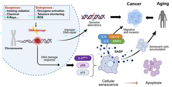 During aging, the sustained secretion of cytokines associated with SASP contributes to the transition toward inflammaging. Among these, IL-6 and IL-1β are the most representative cytokines [96]. IL-6 regulates immune cell differentiation and proliferation, and its elevated systemic levels contribute to chronic inflammatory states that underlie diseases such as sarcopenia, cardiovascular disorders, and insulin resistance. IL-1β, a major component of SASP, is strongly linked to systemic inflammatory responses [99]. In cancer, both IL-6 and IL-1β promote tumor growth and enhance invasiveness. Specifically, IL-6 activates the STAT3 signaling pathway, leading to anti-apoptotic effects and promoting cell proliferation, thereby enabling sustained tumor growth by evading cell death [102]. IL-1β increases invasiveness and fosters a pro-tumorigenic immune microenvironment, thus facilitating carcinogenesis. Another key cytokine involved in both aging and cancer is TNF-α. In aging, TNF-α promotes tissue damage and neuroinflammation, while in cancer, it activates NF-κB signaling, enhancing angiogenesis and metastasis, ultimately creating a microenvironment that supports tumor survival [168].