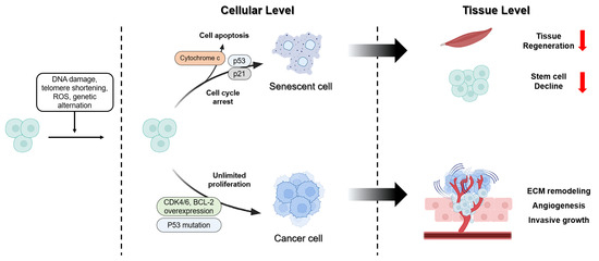 Distinct pathway of cancer and aging in cellular level and tissue level. Cellular stress responses are induced by DNA damage, telomere shortening, ROS, and genetic alterations. In response to these stimuli, some cells undergo cell cycle arrest and apoptosis via the p53/p21 pathway, resulting in the formation of SnCs. Conversely, alterations such as p53 mutations and the overexpression of CDK4/6 and BCL-2 promote unlimited proliferation and drive the transition toward cancer cells. These dis-tinct cellular outcomes result in different tissue level. The accumulation of SnCs reduces tissue re-generation and stem cell decline. In contrast, the proliferation of cancer cells promotes ECM re-modeling, angiogenesis, and invasive growth, thereby enhancing cancer progression.