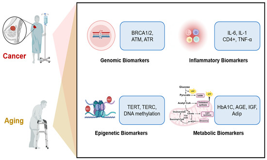 Biomarkers in aging and cancer. Aging and cancer are interconnected through various mechanisms, including genomic instability, chronic inflammation, epigenetic alterations, and metabolic dysregulation. Along these pathways, specific biomarkers are generated—genomic biomarkers (e.g., BRCA 1/2, ATM, and ATR), inflammatory biomarkers (e.g., IL-6, IL-1, and TNF-α), epigenetic biomarkers (e.g., TERT, TERC, and DNAm), and metabolic biomarkers (e.g., HbA1C, AGE, and IGF).