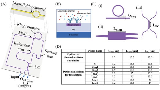Design of the microfluid–integrated, ring-resonator-assisted Mach–Zehnder interferometer (μFRA-MZI). (A) Schematic of the proposed μFRA-MZI. In the RA-MZI (purple color), light from an optical fiber is edge-coupled into the input waveguide and splits into the reference and sensing waveguides using a multi-mode interferometer (MMI). Light from the sensing waveguide is coupled with the ring resonator and combined and affected by light from the reference waveguide in a 2 × 2 directional coupler (DC). Light exits through two output waveguides, i.e., Oref and Osen, to an optical fiber for detection. A microfluidic channel (yellow color) is fabricated directly on the top of the ring resonator. (B) Schematic of label-free sensing of molecules inside of the microfluidic channel. Red triangles and blue circles/Y shapes indicate biomolecules in the microfluidic channel. (C) Design variables for the RA-MZI. (i) Ring gap distance (Gring), (ii) MMI length (LMMI), and (iii) DC length (LDC). (D) 7 RA-MZI devices with different design parameters. Optimized dimensions of Gring, LMMI, and LDC from the simulation were 1.2 μm, 15.5 μm, and 13.5 μm, respectively. Device S had the same dimensions as the optimized dimensions. Devices Gring1 and Gring2 had varied ring gap distances, LMMI1 and LMMI2 had varied MMI lengths, and LDC1 and LDC2 had varied DC lengths, while the other parameters were kept the same as those of device S. The variables that were different from device S are shown in bold.