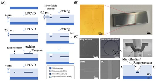 Fabrication process of the μFRA-MZI. (A) Flow chart of the fabrication process. Silicon dioxide (SiO2) and silicon nitride (Si3N4) were deposited using low-pressure chemical vapor deposition (LPCVD) sequentially on a Si wafer as the bottom cladding and the waveguide, respectively. The waveguide structure and the ring resonator were patterned by etching Si3N4 using reactive ion etching (RIE), followed by SiO2 deposition via LPCVD as the top cladding. The microfluidic channel and facet were etched by RIE on the top SiO2 cladding and sealed using polydimethylsiloxane (PDMS). Note that there was a 0.7 μm thick layer of SiO2 between the ring resonator and the bottom of the microfluidic channel to protect the ring resonator’s surface without compromising its sensitivity. (B) Representative bright-field images of a fabricated μFRA-MZI device (i.e., LDC1). The size of the entire device was 1.7 cm (width) × 2.5 cm (length) × 0.5 cm (height). Eight square electrical contact pads in the middle of the device were not fabricated or used in this project. (C) Representative Scanning Electron Microscope (SEM) images of the ring resonator, microfluidic channel, MMI, and DC. The cross-sectional image (right) confirmed the alignment of the microfluidic channel with the ring resonator. The width and height of the microfluidic channel were 3 μm and 3.4 μm, respectively.