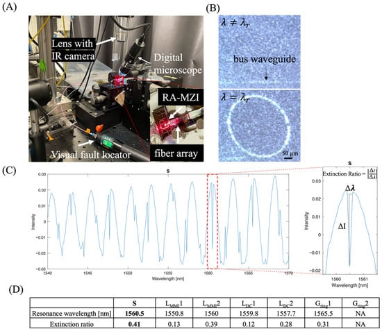 Determine the extinction ratio (ER) of RA-MZI fabricated with different design parameters. (A) Representative bright-field image of the experimental setup. A 650 nm red light was used to visualize and facilitate light–waveguide coupling. For precise alignment between the RA-MZI device and the fiber array, a visual fault locator, a digital microscope, and an IR camera were employed. (B) Representative infrared images showing the coupling between the bus waveguide and the ring resonator when a resonance wavelength () was achieved. (C) Typical data plot used to calculate the ER of an RA-MZI. ER was defined as the difference in the output power intensity () divided by the difference in the wavelength (). Data were obtained using device S. (D) Experimentally measured maximum ER in fabricated devices. Device S showed the highest maximum ER of 0.41 at the resonance wavelength of 1560.5 nm among all devices. In the case of Gring2, the gap distance was too large, preventing light from coupling into the ring resonator, resulting in no observable resonance peaks.